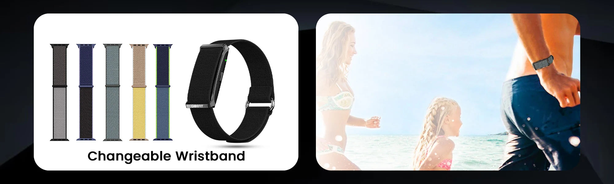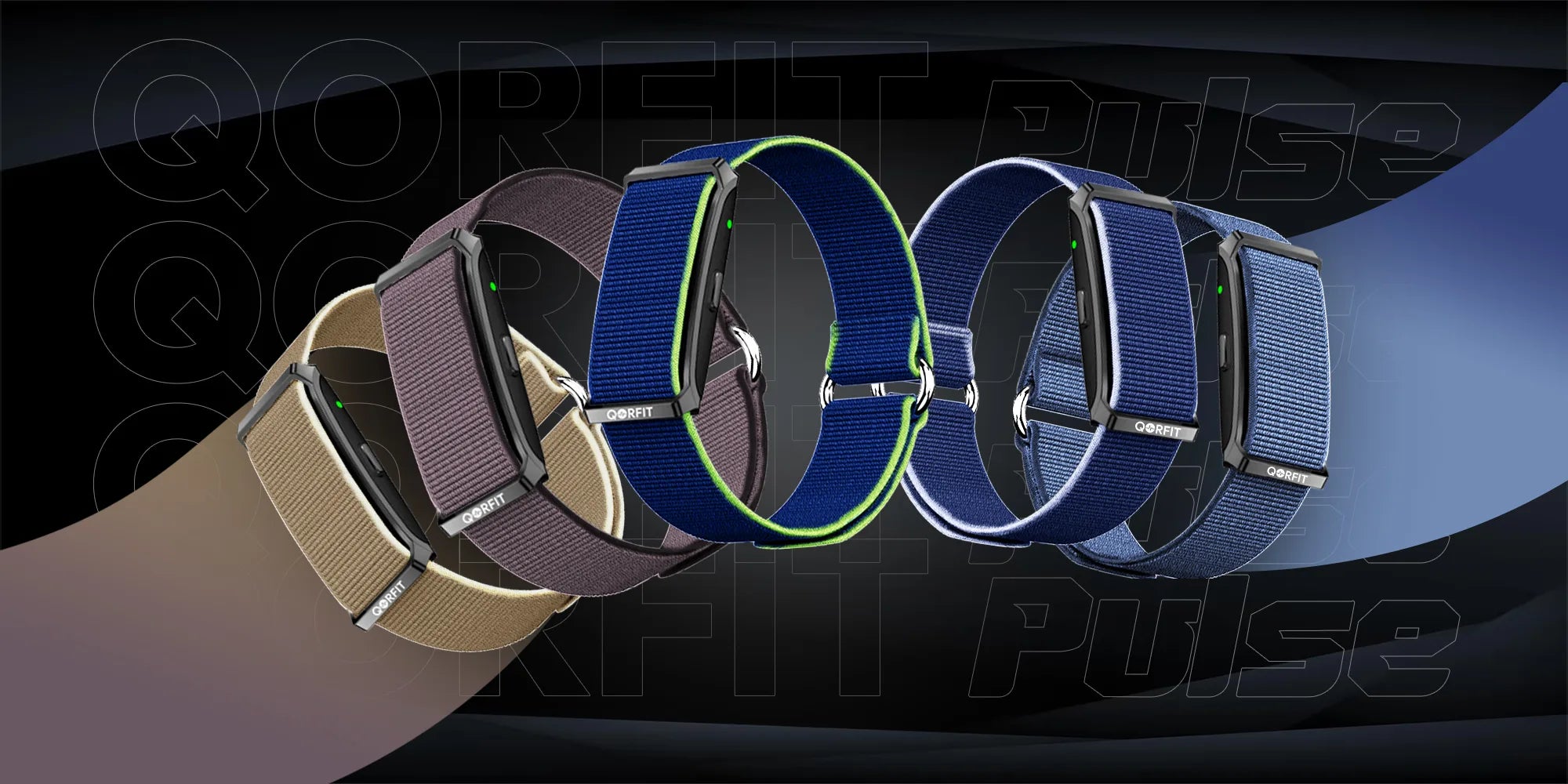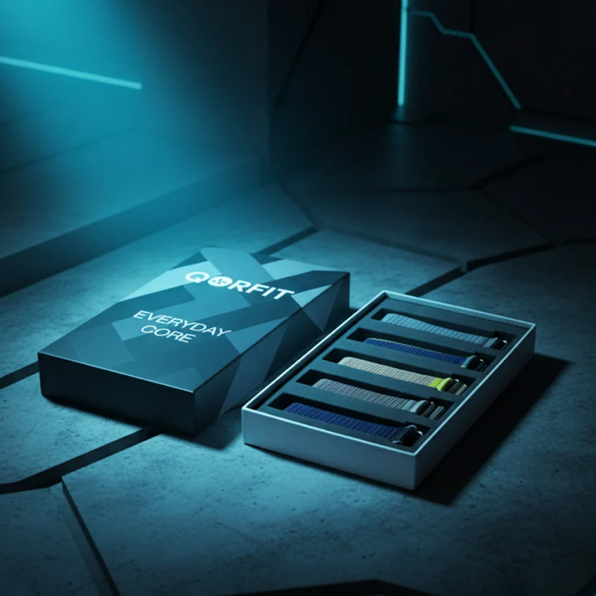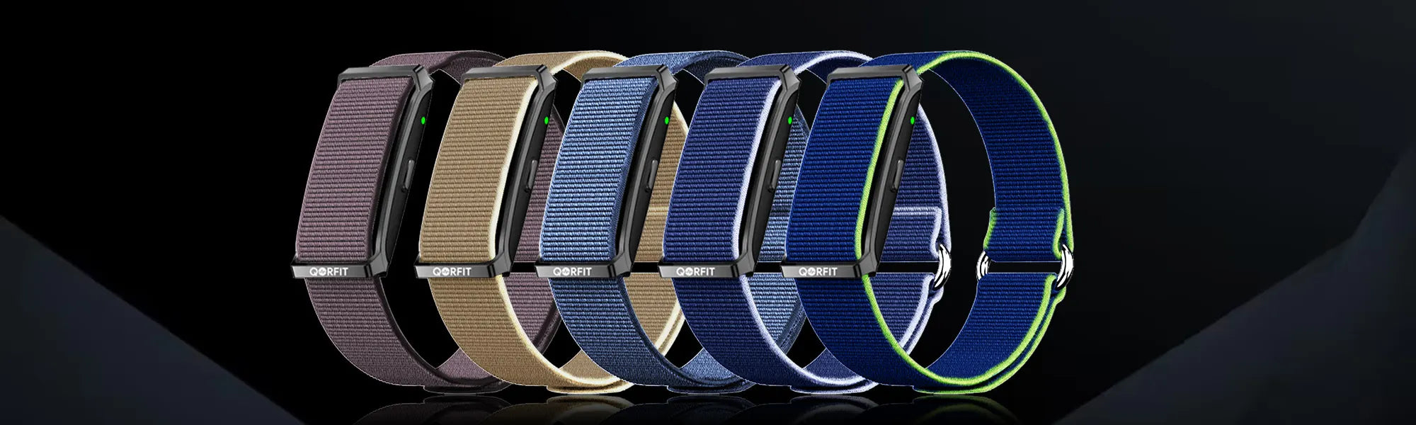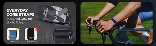 Two bands are included with the Qorfit Pulse: one black nylon and one black silicone. Colour bands are sold separately in packs of 5, available in two types — EVERYDAY CORE and VIBE CORE.