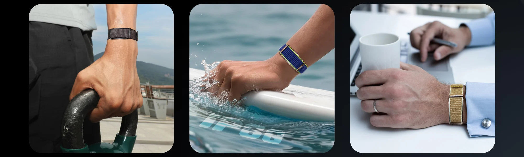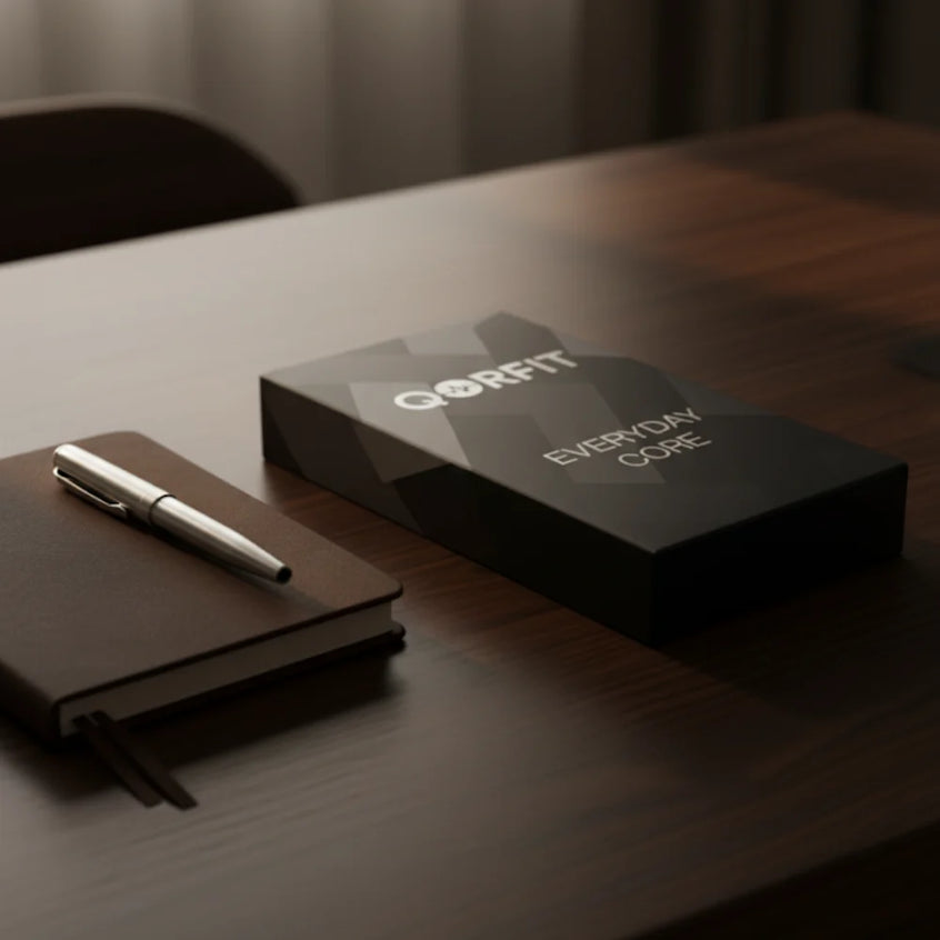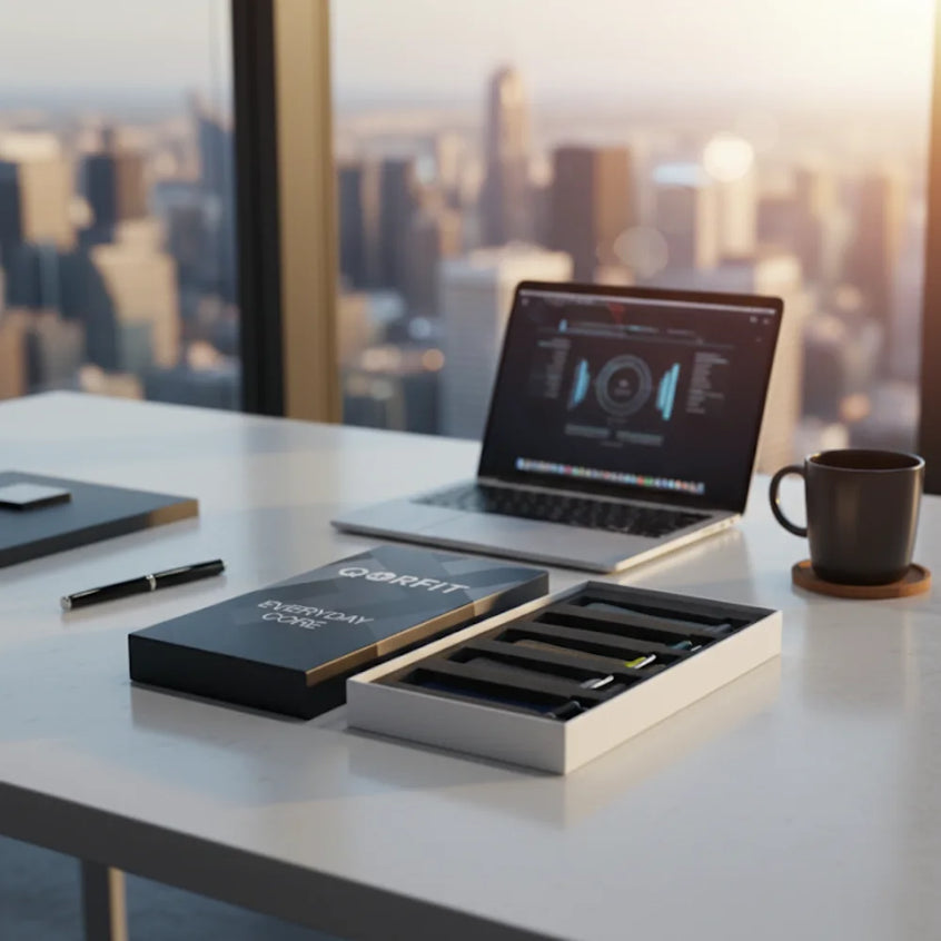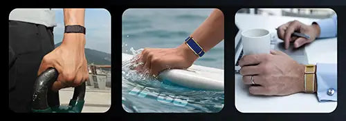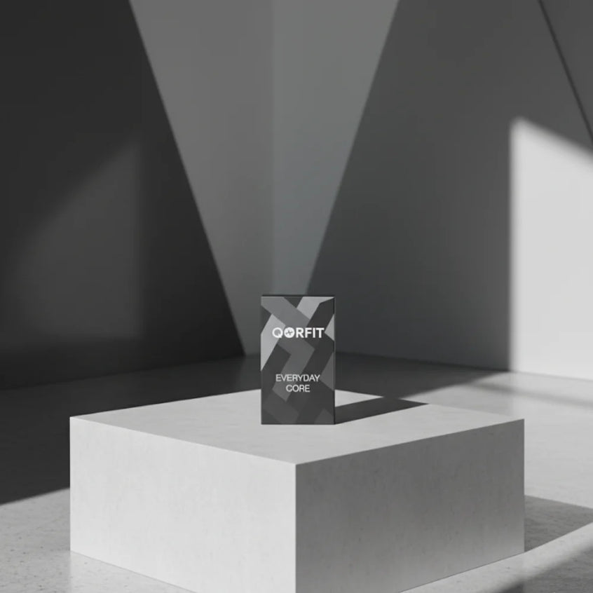Two bands are included with the Qorfit Pulse: one black nylon and one black silicone. Colour bands are sold separately in packs of 5, available in two types — EVERYDAY CORE and VIBE CORE.