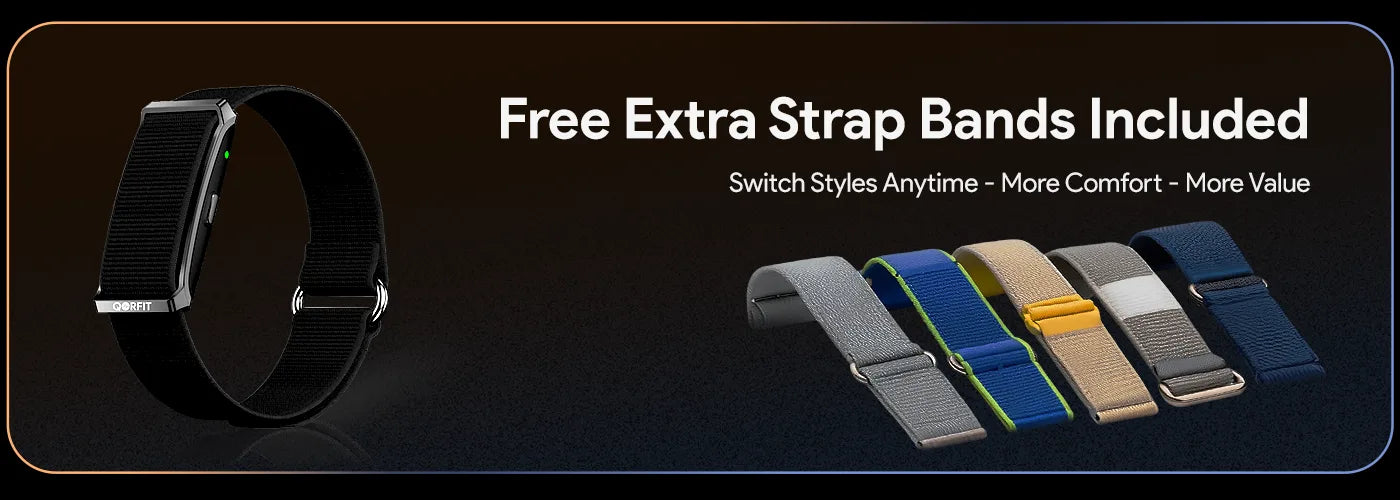 Two bands are included with the Qorfit Pulse: one black nylon and one black silicone. Colour bands are sold separately in packs of 5, available in two types — EVERYDAY CORE and VIBE CORE.