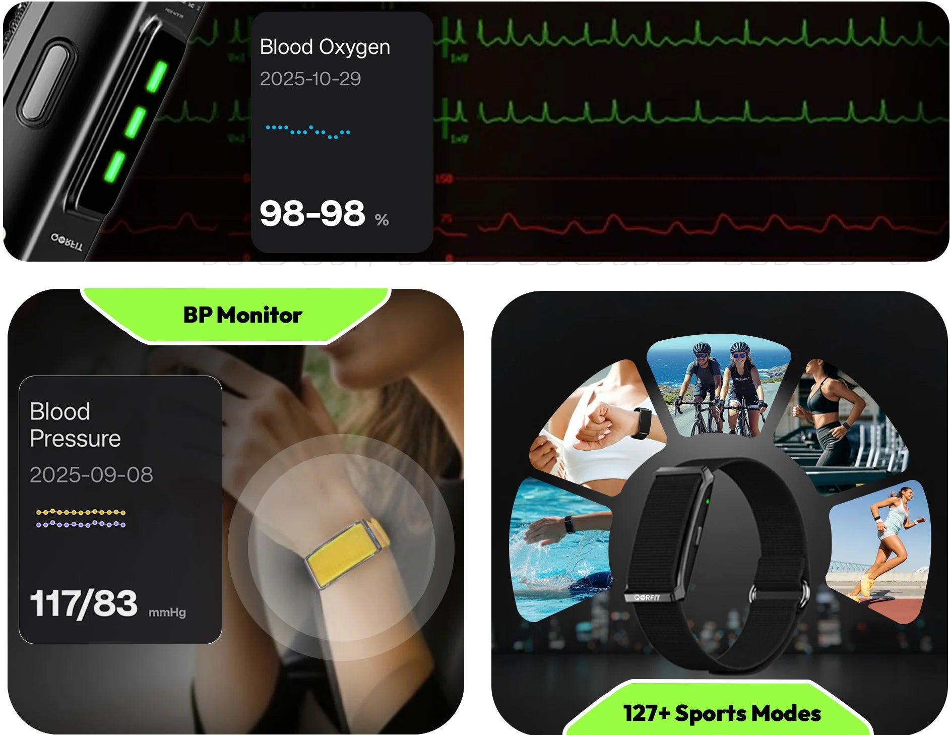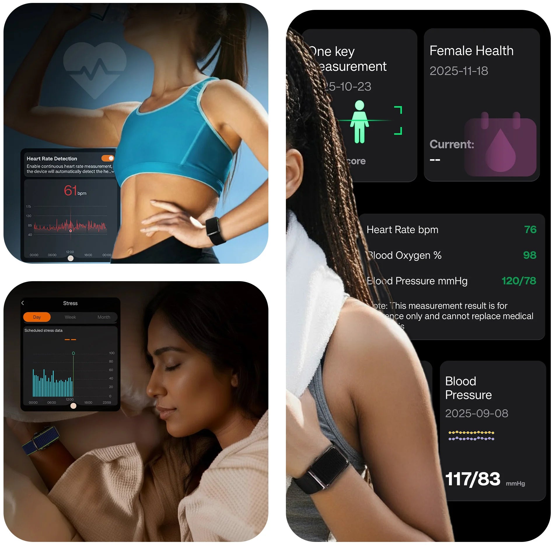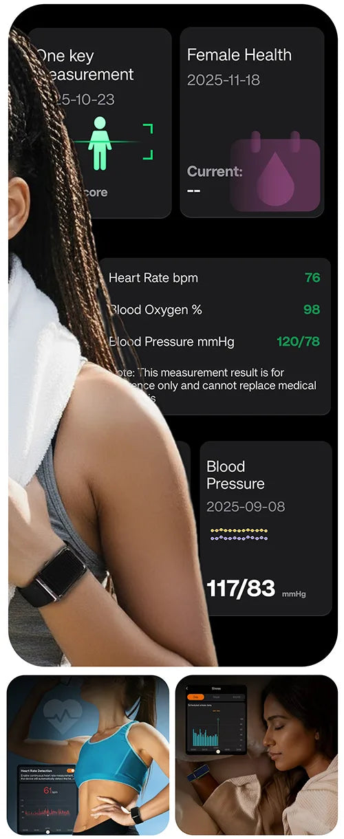 No screen; designed for distraction-free continuous health data.