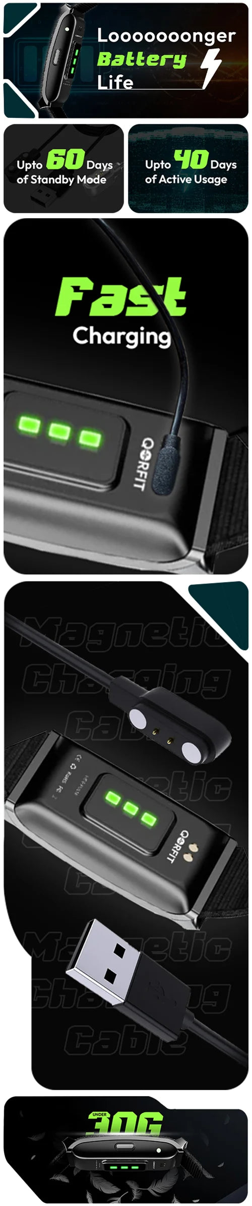 The battery lasts up to 45 days with optimal use; otherwise, it lasts about 30 days under regular usage. The device fully charges in approximately 2 hours.